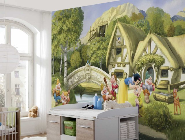 Pagini de basm pe perete in camera fetitei tale. In spatele muntilor traieste preafrumoasa si dragalasa Alba ca Zapada, in casuta piticilor.