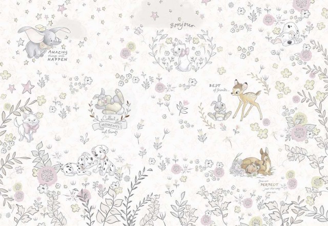 Toate animalele dragute din povestile Disney: Bambi, Thumper, Dumbo, reunite intr-un delicat fototapet decorativ tocmai potrivit pentru un perete din camera celui mic.