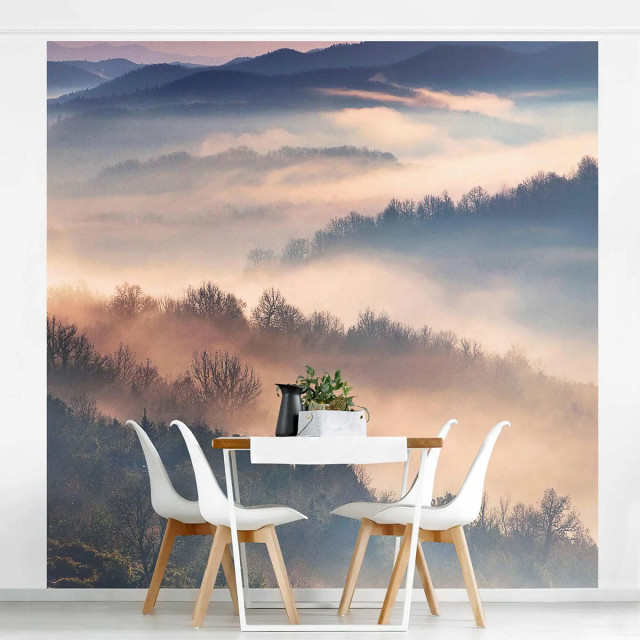 Natura nu inceteaza sa ne surprinda mereu si sa fie o inspiratie continua pentru fototapete. Peisajul cu ceturile colorate de soarele care apune peste vai creeaza o atmosfera de reverie, plina de frumusete.Un fototapet de atmosfera realizat pe material vlies care permite peretelui sa respire. Se poate sterge cu un burete umed. Fototapetele pe material vlies ( netesut) se aplica usor. Adezivul este inclus.