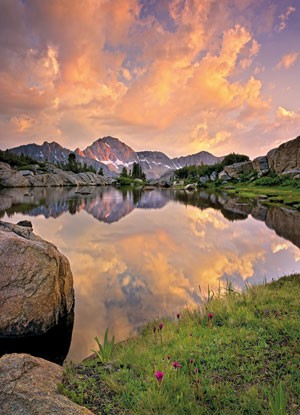 Fototapet cu un peisaj splendid realizat dupa o fotografie minunata din zona muntilor Alpi, cu un apus de soare inspirational, reflectat in lacul de munte, care induce o atmosfera romantica.