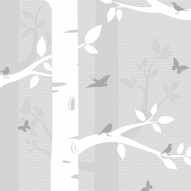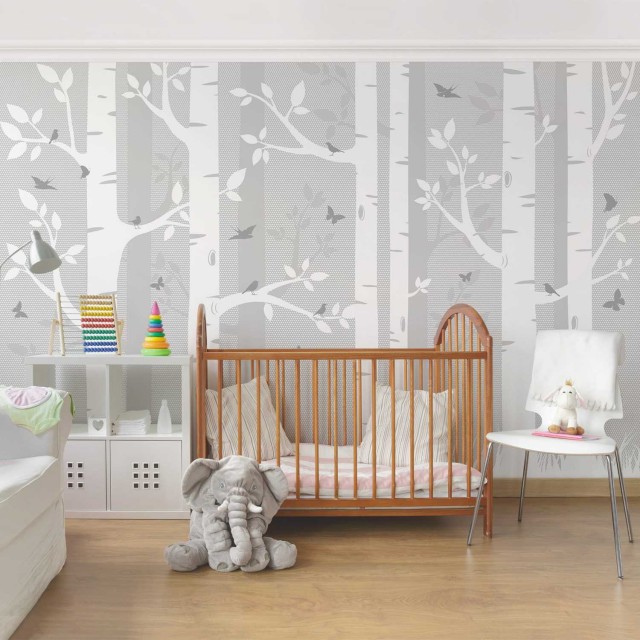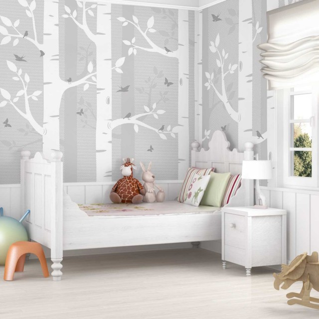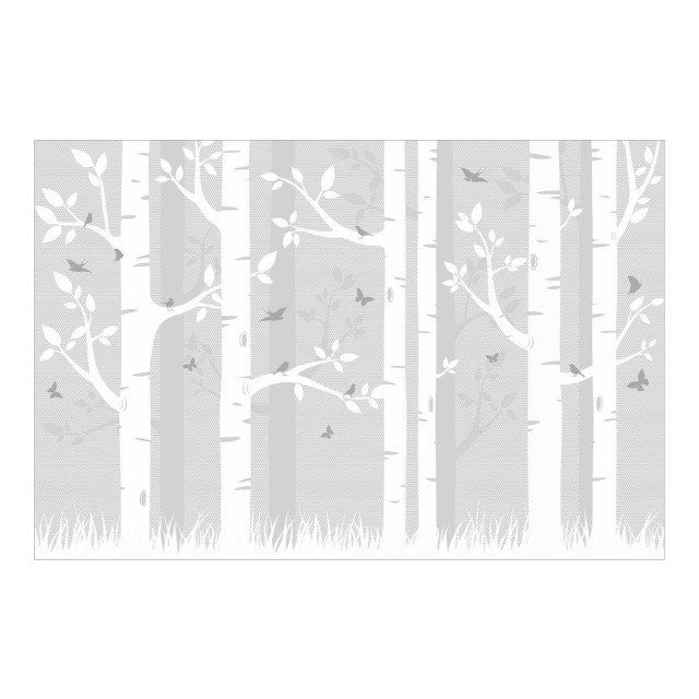 Un colt de natura stilizat, in alb si gri pentru un decor in camera copilului. Acest fototapet vlies cu mesteceni, fluturi si pasari este realizat pe suport netesut ( vlies) care ii confera anumite avantaje, vezi putin mai jos.