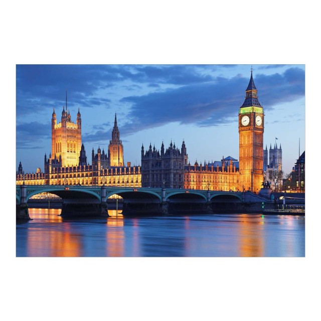 O imagine simbol a Londrei cu Palatul Westminster, turnul cu ceas Big Ben si Podul Westminster peste Tamisa, in lumina albastra.