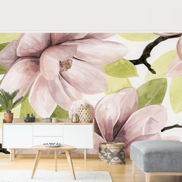 Fototapet suav si delicat cu gigante flori de magnolie pictate, compus din 6 fasii verticale pentru o aplicare usoara. Un fototapet care-ti va bucura privirea in dormitor sau in orice camera ti-ar placea sa-l aplici.