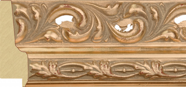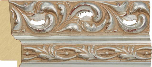Oglinda de cristal inramata cu rama de lemn eleganta, argintie sau aurie, patinata, cu luciu si ornamente dantelate in relief . Rama lata de 9.2 cm se poate vedea in detaliu in imaginea auxiliara.