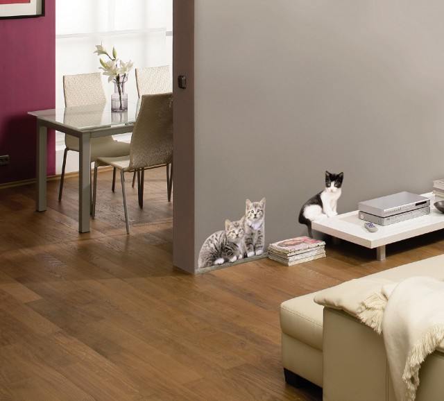 Acest sticker cu pisicute este potrivit pt camera copiilor. Este autocolant pe baza de vinil, pretaiat, imprima un efect spectaculos interioarelor; usor de folosit, se dezlipeste si se repozitioneaza;nu afecteaza suprafetele; se poate aplica pe perete, usi, geamuri, oglinda, ceramica; instructiuni de folosire: asigura-te ca suprafata pe care se aplica este uscata, curata si fara grasimi; dezlipeste cu atentie, pozitioneaza in locul dorit si preseaza cu o bucata de material textil pe toata suprafata. Se poate repozitiona. De retinut ca se aplica doar imaginea, a carui contur se decupeaza perfect, fara a fi necesar un fundal, acesta constituindu-l chiar peretele. Produs in Germania.