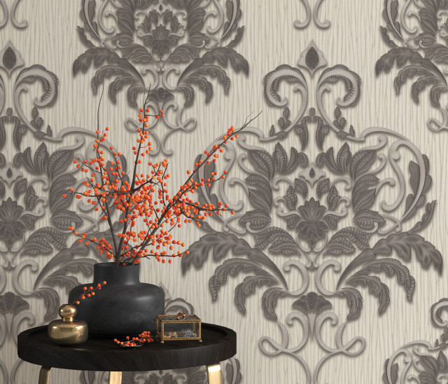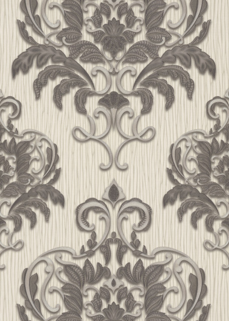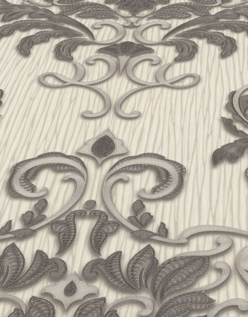 Tapet clasic, model baroc, gri, argintiu, cu sclipici fin, vinil compact, extralavabil, pe suport de bumbac netesut (vlies). Dimensiune rola: 53cm x 10m.