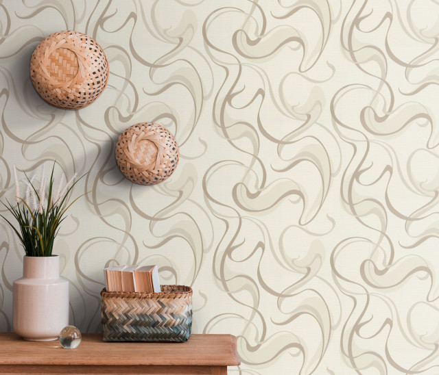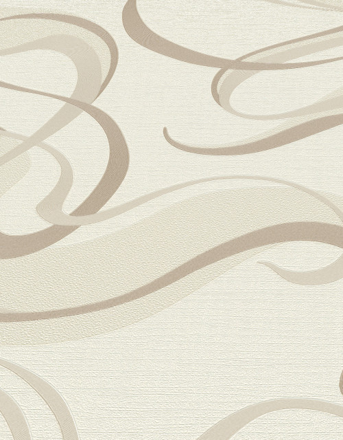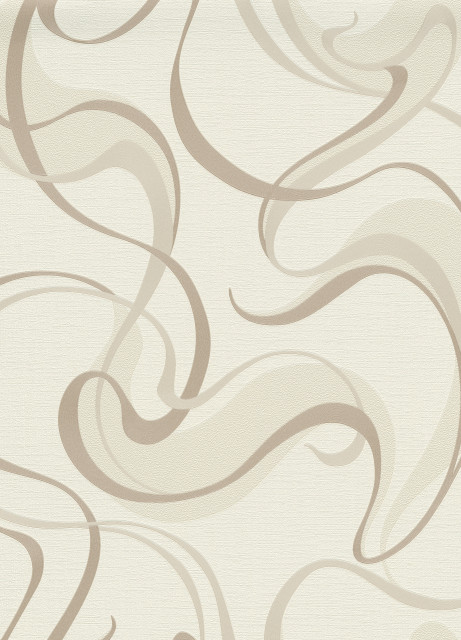 Tapet modern geometric cu linii curbate, unt, maro, vinil compact, extralavabil, pe suport de bumbac netesut (vlies). Dimensiune rola: 53cm x 10m.