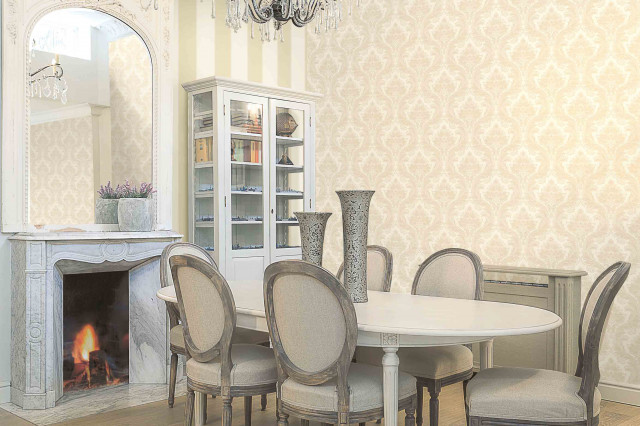 Tapet superlavabil cu model cladic baroc cu model plin si suprafata texturata cu straluciri metalice.Este un tapet rezistent la uzura, potrivit pentru dormitoare si livinguri.