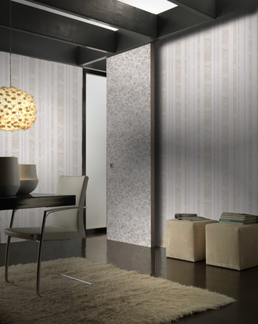 Tapet cu dungi cu aspect decolorat, ceea ce-i confera un aer mai retro dar si modern in acelasi timp si cu aspect textil.