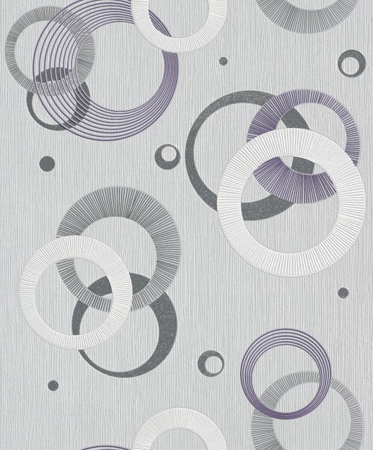 Modelul cu cercuri albe, mov si gri metalizat pe fundal gri al tapetului va conferi un decor modern interioarelor.