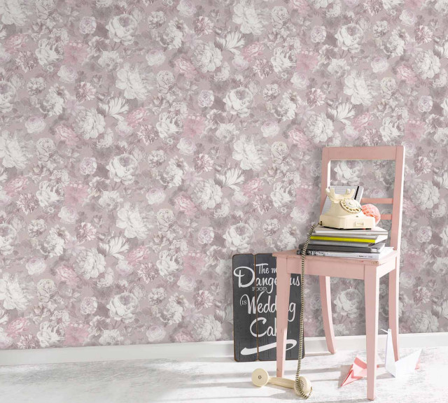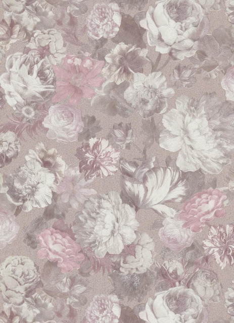 Tapet superlavabil cu flori argintii, roz, mov prafuit si suprafata texturata. Se monteaza usor fiind un tapet pe suport vlies.