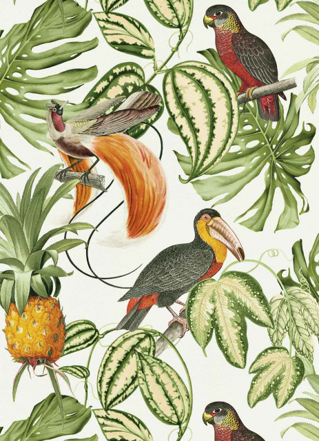 Tapet lavabil vintage cu frunze, pasari exotice si ananas intr-un decor exotic verde, portocaliu si alb. Acest tapet se aplica foarte usor.